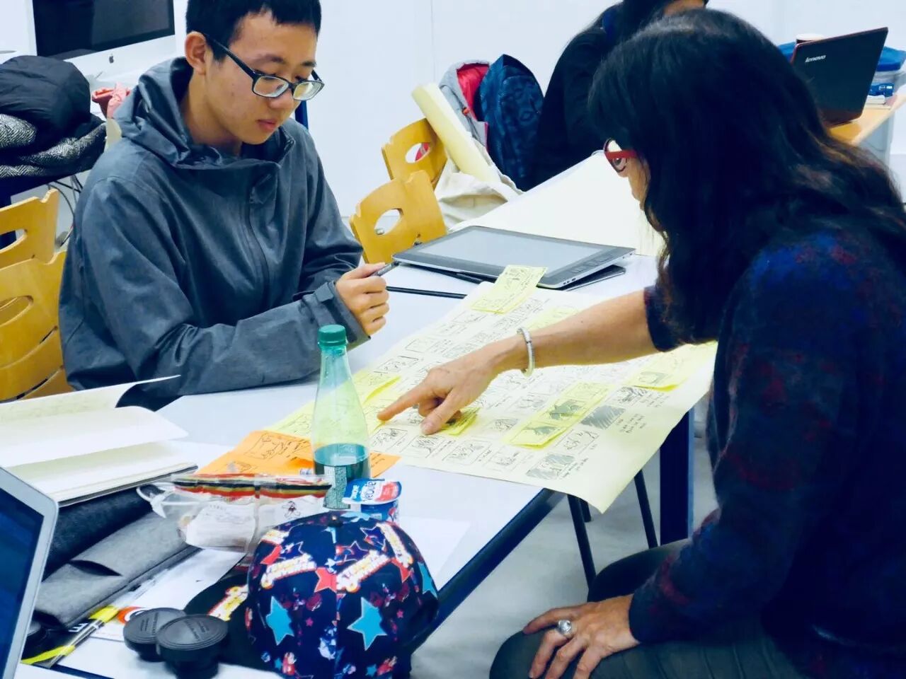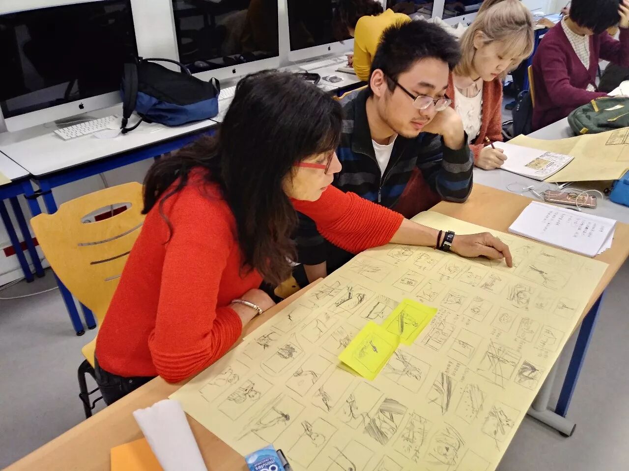 最后一周的课程,大家开始全神贯注制作动态。一个月的时间并不充裕,在高布兰学院,能加班熬夜,大家只能加快白天的进度。老师的唯一要求是完整,每个镜头不需要制作得很细致,但整体故事要完整表现。期间老师还展示了刚刚带领的大二学生制作的昂西电影节片头短片以及毕设作品的动态分镜,大家共同观看,听过讲解后,了解了应该怎样制作动态分镜。